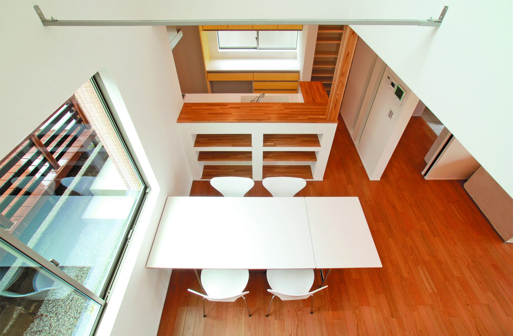 リビングには吹き抜けがあり、コンパクトながらも開放的な空間を演出しています。